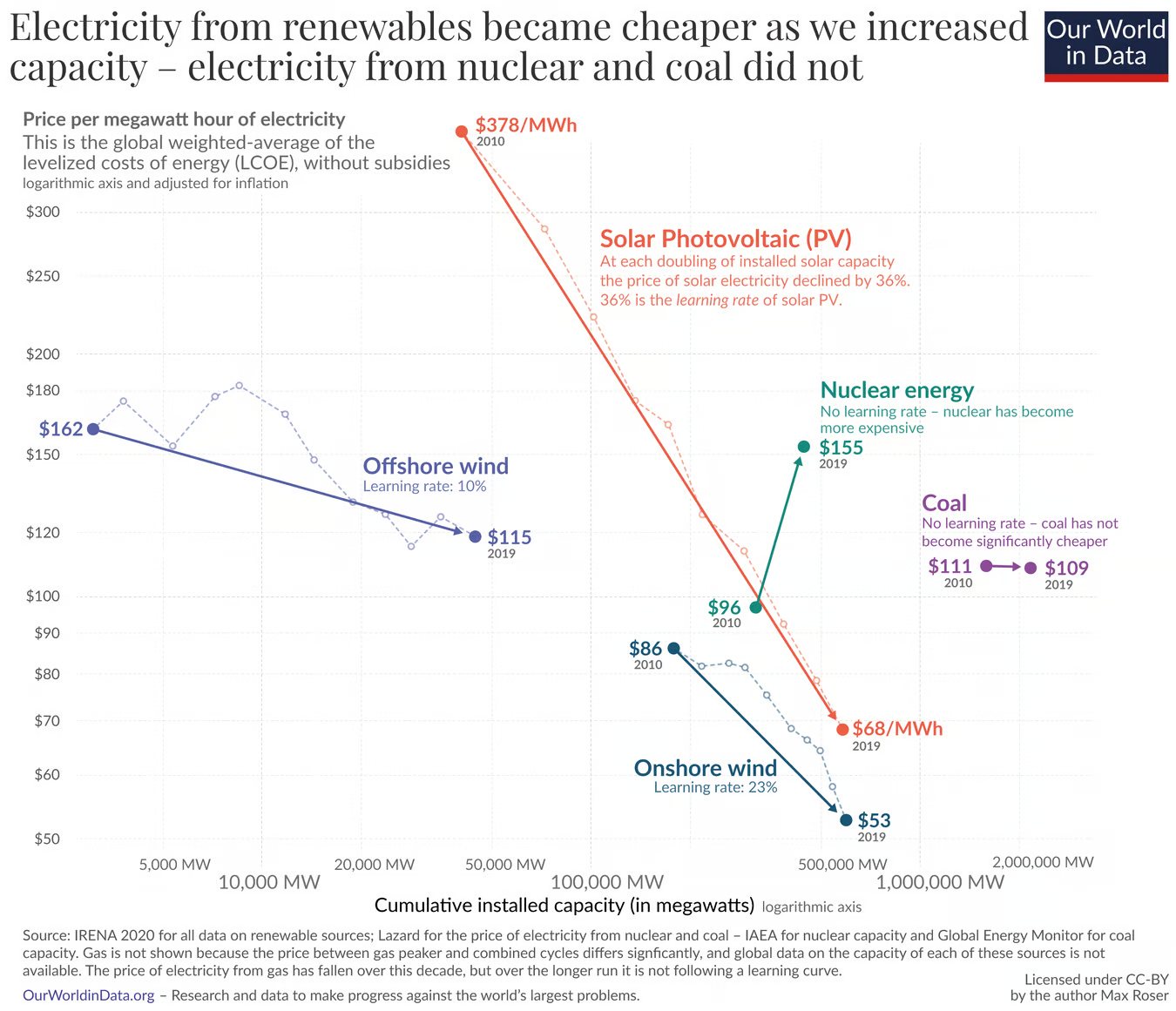 https://ourworldindata.org/cheap-renewables-growth Max Roser (2020) – “Why did renewables become so cheap so fast?” Published online at OurWorldinData.org. Retrieved from: ‘https://ourworldindata.org/cheap-renewables-growth’ [Online Resource]